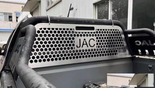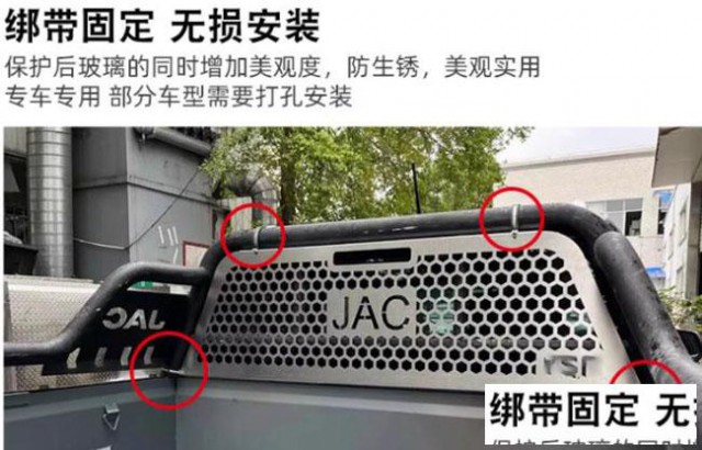 江淮悍途帅铃t6/t8皮卡车后窗龙门架防护网防撞网,加厚不锈钢材质,原车开模,高温不变形,弹性好不生锈。整块板子冲孔而成,无拼接。绑带固定,无损安装。与龙门架搭配使用,防护驾驶室玻璃,提升颜值。