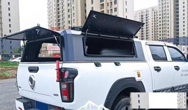 长城炮皮卡车整体三开门后箱盖高盖改装架,锰钢材质,侧窗带玻璃款,整体打磨。带有液压升降窗盖,快速开合,轻松打开。带高位刹车灯,提高行车安全。卡扣固定安装,免打孔,结实牢固。带锁设计,安全放心。