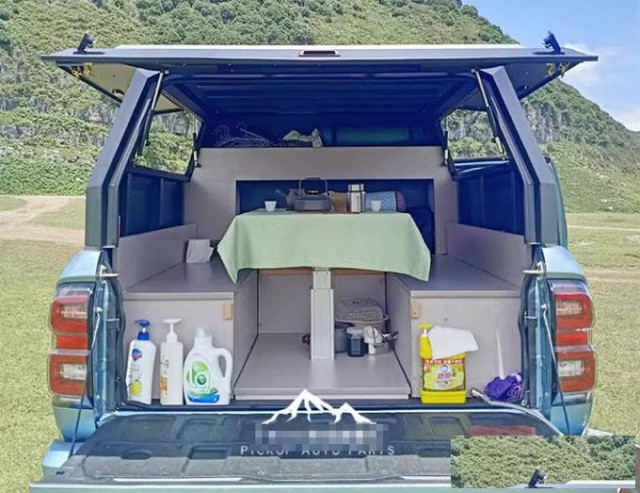 上汽大通江铃宝典达咖皮卡车加高30cm后箱高盖改装,全金属材质,整体打磨。带有液压升降窗盖,快速开合,轻松打开。带高位刹车灯,提高行车安全。卡扣固定安装,免打孔,结实牢固。带锁设计,安全放心。自带脚蹬,可登盖顶。