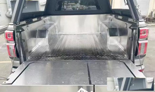 长城山海炮皮卡车不锈钢后箱宝货箱宝垫子改装,不锈钢加厚板材,一体冲压面板成型,激光满焊拼装,产品贴合度高。自带绑绳挂钩,方便实用。耐磨损耐腐蚀,美观又实用。