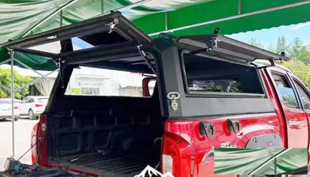 福田大将军g9驭途9拓路者皮卡车三开门高盖后箱盖子,锰钢材质,遮阳挡雨,结实耐用。原车数据开模,整体三开门设计,两侧窗及尾部可打开,带有液压撑杆。免打孔安装,利用卡扣固定。带锁设计,安全可靠。带高位刹车灯,提高行车安全。一侧可登盖顶。