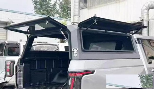 东风锐骐z9新能源混动皮卡车三开门高盖后箱尾箱盖改装,锰钢材质,整体打磨,结实耐用。原车数据开模,贴合车身。带液压升降窗盖,快速开合。带高位刹车灯,提高行车安全。卡扣安装,免打孔。带锁设计,有效防盗。