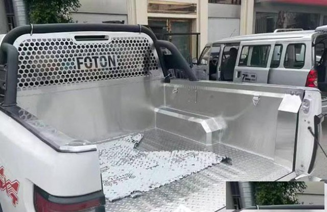 福田火星七火星9皮卡车后箱宝货箱宝尾箱垫改装件,不锈钢材质,高温不变形,抗压耐腐蚀不易生锈,有效保护新车漆面。采用满焊工艺,美观防水。采用原车开模,贴合车身,自带绑绳挂钩,方便实用。