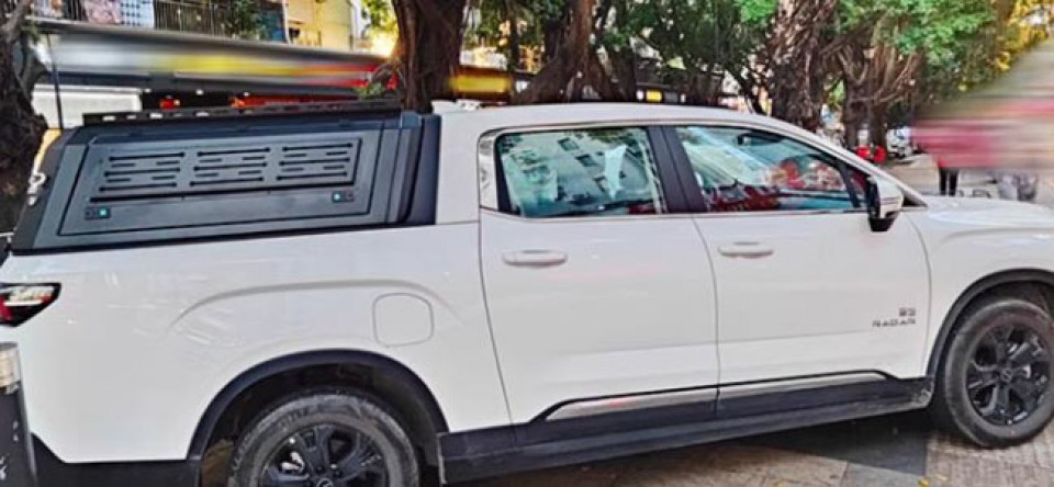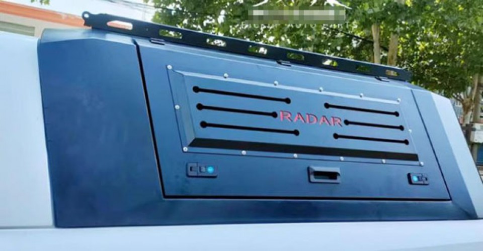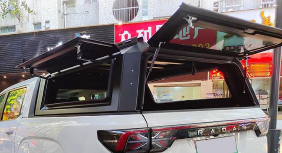 雷达RD6皮卡车铝合金三开门后箱高盖旅居多功能拓展盖改装件,铝合金材质,采用电泳防锈处理,防雨防晒。带有高位刹车灯,提高行车安全。一侧带脚蹬,可登盖顶。三面开合,结实耐用。免打孔安装,带锁。
