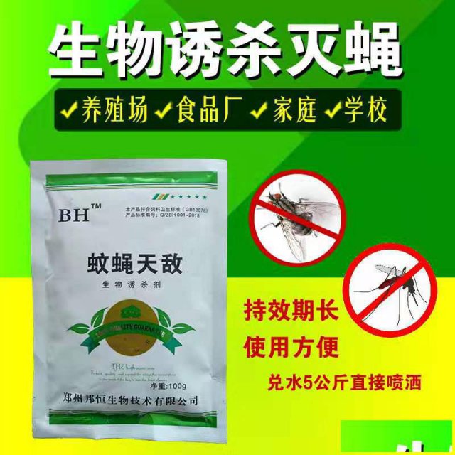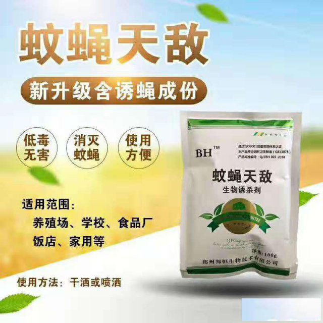 夏秋两季,生活中蚊蝇乱飞令人讨厌,对人体、动物无害的灭蚊蝇药被人青睐。郑州邦恒生物技术有限公司销售的蚊蝇天敌,15元的低成本灭蚊蝇,对人畜无害。蚊蝇天敌为可分散粉剂,低毒,对养殖场(养鸡场、养猪场、动物圈舍、屠宰场等)工厂,食品厂,超市,餐厅,学校,小区,室内外中常见的各种抗性蚊蝇类具有强烈的诱杀、触杀、胃毒以及独特的趋避作用,滞留喷洒用药一次,可保持1个月左右无蚊蝇。 使用技巧: