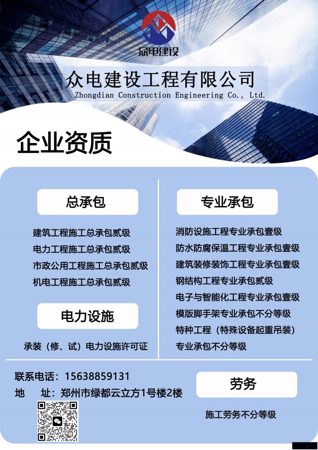 众电建设集团拥有丰富的 资源,拥有电力施工总承包二‌‌‌‌‌‌级,市政工程总承包三级、市政公用工程施工总承包二级、建筑工程施工总承包二级、房建工程总承包三级、机电工程总承包三级、防水防腐保温工程专业承包二级、消防设施工程专业承包二级同时具有电力承装二级承修二级承试二级 ,希望与有实力的伙伴开展战略合作,实现优势互补,资源共享。能够帮助您增强企业的核心竞争力,满足业主对工程项目的 要求。能够协助您搞好工程项目运作,提高工程项目的中标率和成功率。
