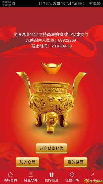 第二:淘优乐除了对接淘宝京东等商城外,将上线链豆商城,链豆商城商品将可以通过链豆支付购买。后期还将逐步对接线下各类实体应用,包括景点旅游、酒店住宿、教育培训咨询服务等,让手持链豆的人有线上线下消化渠道。简单而言:链豆可以升值,也可以用于商城购物,确保不管哪一阶段的用户进入,都将从链豆身上获得价值体验。这个就是区块链模式下的新想法,既可以给客户拥有链豆升值提现,也可以给客户进入商城购买日常用品。新模式新趋势。