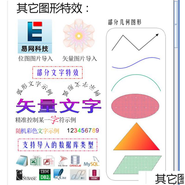 可以绘制矩形、(椭)圆形、三角形、多边形、线段、曲线、文字等多达15种图形对象;图形可随意拉伸、压缩、旋转等;封闭式图形支持渐变色、背景图案等填充方式;图形尺寸、位置、旋转角度可精细化设置;数据类图形支持数据的批量生成或导入;图形编辑支持对齐、等间距等常规图像处理方法。
