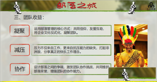 1.凝聚:运用部落管理的核心方式:共同信仰,友爱互助, 将企业文化仪式化,凝聚团队。